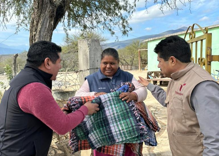 Familias de los municipios más desprotegidos de Tamaulipas recibieron apoyos de cobijas ante el impacto del Frente Frío 27 que dejó temperaturas congelantes en la entidad.