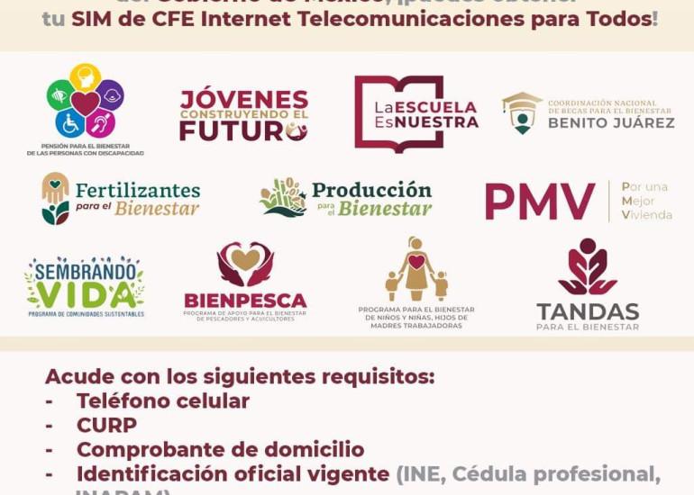 En tanto que si las personas ya son parte de estos programas y viven en alguna localidad enlístada y desean adquirir una tarjeta SIM de #CFE INTERNET completamente gratis, deberán comunícarse a la Oficina de Bienestar Local o bien al número de atención ciudadana con los números 5528344800 o desde una línea CFE *444, por otro lado está también hábil la línea de WhatsApp 9616280054 con un horario de Lunes a Domingo de 9:00 a 21:00 horas (Hora del centro de México)