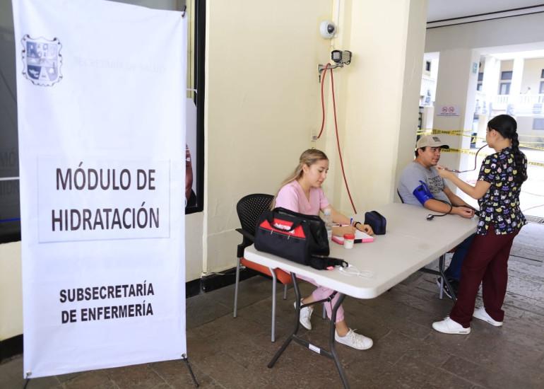 Como parte de las acciones implementadas por el Gobierno del Estado para enfrentar la tercera ola de calor que presenta temperaturas extremas, la Secretaría de Salud, a través de la Subsecretaría de Enfermería, instaló módulos de hidratación y chequeo de presión arterial para las personas que lo requieran.