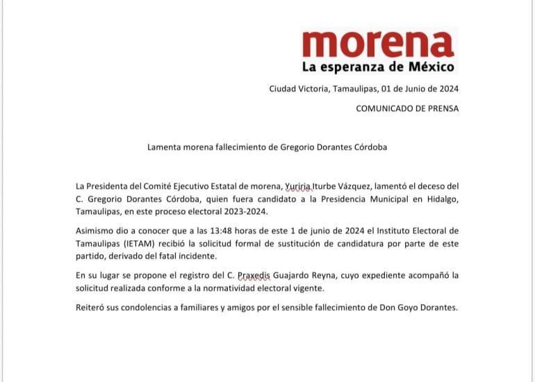 Asimismo dio a conocer que a las 13:48 horas de este 1 de junio de 2024 el Instituto Electoral de Tamaulipas (IETAM) recibió la solicitud formal de sustitución de candidatura por parte de este partido, derivado del fatal incidente.