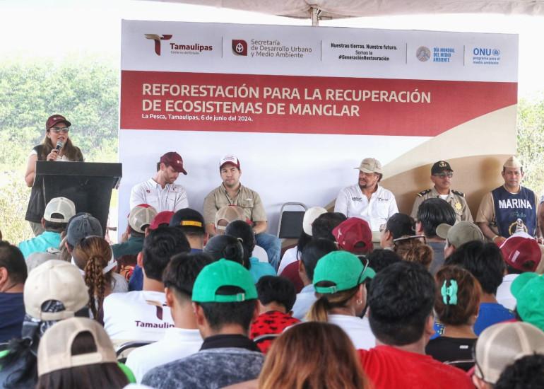 Durante el evento, la titular de la SEDUMA, Karina Lizeth Saldívar Lartigue, resaltó que bajo el lema "Somos la Generación de la Restauración", se hace un llamado para que las y los tamaulipecos se sumen al rescate y cuidado de este tipo de áreas naturales que contribuyen a contrarrestar los efectos del cambio climático.