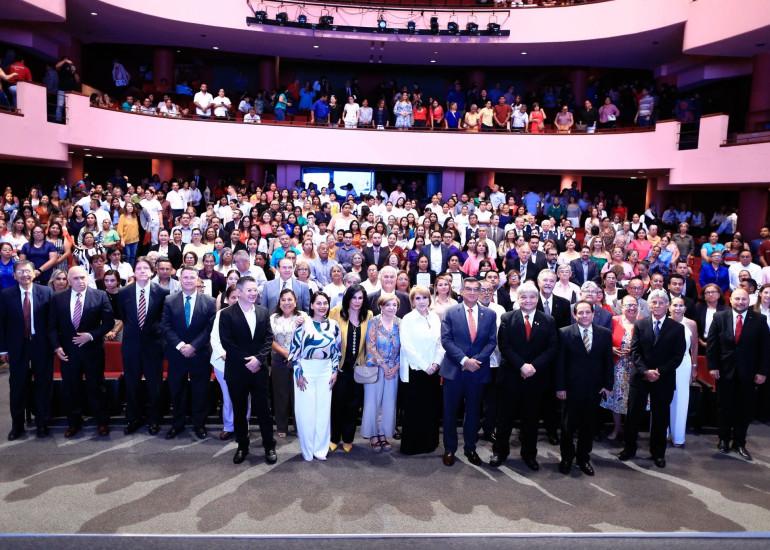 Al clausurar el Simposio Médico “Por la Alegría de Verlos Sanos”, realizado en el marco de esta celebración, en una emotiva ceremonia efectuada en el teatro Amalia G. de Castillo Ledón y acompañado por el secretario de Salud, Vicente Joel Hernández Navarro, el gobernador entregó reconocimientos a diez exdirectores de este centro médico, así como a profesionistas y trabajadores con 40 años de servicio y a los seis ponentes que participaron en el simposio.