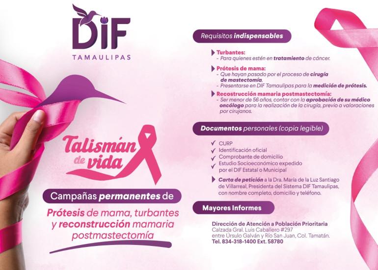 Con el firme propósito de respaldar a las mujeres que enfrentan o han enfrentado la lucha contra el cáncer de mama, el Sistema para el Desarrollo Integral de la Familia de Tamaulipas, que preside la doctora María de Villarreal, mantiene abiertas las campañas permanentes de prótesis de mama, turbantes y reconstrucción mamaria postmastectomía.