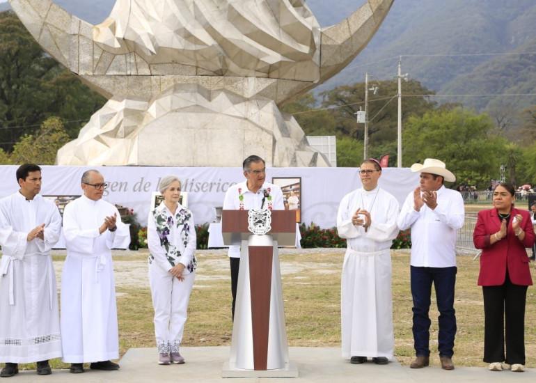 Entregan Américo y María escultura monumental de la Virgen de la Misericordia en El Chorrito