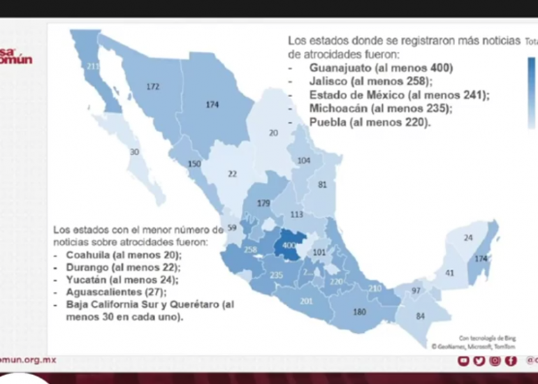 Los estados con mayor número de atrocidades son Guanajuato, con al menos 586; Jalisco, con al menos 374; Michoacán, con al menos 307; Chihuahua, con al menos 295; y Veracruz, con al menos 279.