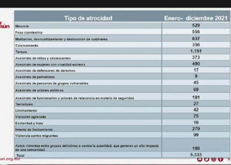 De enero a diciembre se presentaron al menos 1,151 casos de tortura; al menos 837 casos de mutilación, descuartizamiento y destrucción de cadáveres; al menos 556 fosas clandestinas; al menos 529 masacres; al menos 490 asesinatos de mujeres con crueldad extrema; y al menos 373 asesinatos de niñas, niños y adolescentes.